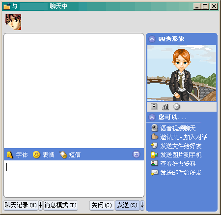 2003的聊天界面也增加了聊天對象的QQ秀形象的顯示,并且增加了一些常用按鈕,邀請他人參與、發(fā)送文件等。