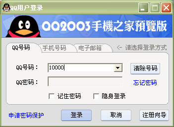 登陸方式在登陸方式上,QQ 2003進行大的改變。由于QQ號碼位數(shù)的增加,有的QQ號碼已經(jīng)達到了九位非常難記,QQ 2003則增加手機號碼和Email登錄方式,通過手機和Email與QQ的綁定,可以輕松的通過電子郵件和手機號碼登陸。MSN