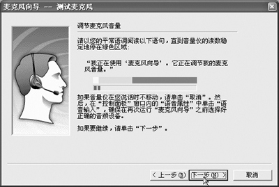 待音量儀式穩(wěn)定后,點(diǎn)擊“下一步”測試麥克風(fēng)的安放位置,再次朗讀對(duì)話框中的例句,然后聽一下回放的錄音是否清晰。一切調(diào)整好后,點(diǎn)擊“完成”。