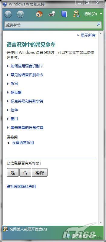 如果你不明白一些事要如何操作,你可以通過說“我能說什么”來使用幫助。在使用“我能說什么”命令之后,Windows的幫助和支持就會(huì)彈出,你可以在里面尋找你所需要的幫助信息。