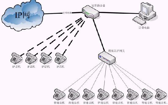 1、 最典型的IP話吧的聯(lián)接方式是寬帶線路連接寬帶路由器,計費(fèi)電腦和模擬語音網(wǎng)關(guān)連接寬帶路由器,普通話機(jī)連接模擬語音網(wǎng)關(guān),通過計費(fèi)電腦可以控制模擬語音網(wǎng)關(guān)上的各個話路,其操作包括開機(jī)、停機(jī)、計費(fèi)和統(tǒng)計話費(fèi)等。