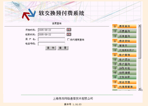 - 話費(fèi)查詢:可根據(jù)用戶名稱(代理商名稱)、主叫號(hào)碼(或號(hào)碼段)、起止時(shí)間等條件快速查詢通話費(fèi)用。