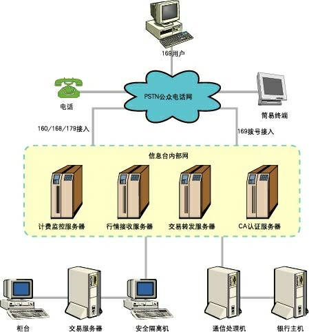2) 與169多媒體信息平臺通過網(wǎng)關(guān)互聯(lián),最大限度實現(xiàn)數(shù)據(jù)共享,并且證券公司營業(yè)部可通過一條DDN完成電話委托和網(wǎng)上交易的業(yè)務(wù),大大降低證券公司日常運營費用,同時能最大限度地吸引異地、鄉(xiāng)鎮(zhèn)用戶。