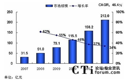 再來(lái)看看統(tǒng)一市場(chǎng)的前景,下圖是某咨詢(xún)公司對(duì)國(guó)內(nèi)統(tǒng)一通信市場(chǎng)的預(yù)測(cè)數(shù)據(jù),2012年將達(dá)到212億元,盡管可能存在一定水份,但這么多公司介入這個(gè)市場(chǎng),本身就體現(xiàn)了發(fā)展?jié)摿,這點(diǎn)不容懷疑。