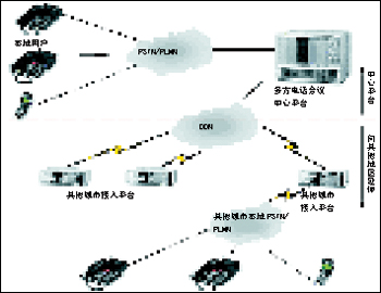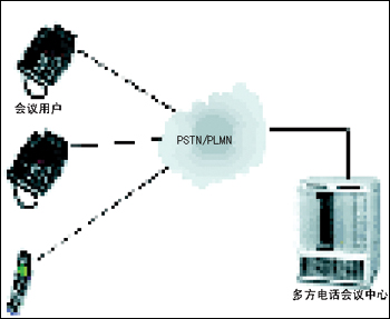 目前,根據(jù)建設(shè)思路中所提到的分期實(shí)施原則,第一期只完成本地多方電話(huà)會(huì)議中心平臺(tái)的建設(shè)。參加電話(huà)會(huì)議的各方用戶(hù)均直接通過(guò)公眾電話(huà)網(wǎng)撥入中心平臺(tái),由中心平臺(tái)統(tǒng)一接入并組織會(huì)議資源為用戶(hù)服務(wù),結(jié)構(gòu)如圖2所示。