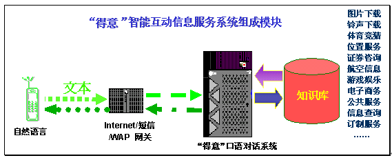 "得意口語(yǔ)對(duì)話系統(tǒng)"可以充分滿足互聯(lián)網(wǎng)、短信、WAP等業(yè)務(wù)的智能互動(dòng)信息服務(wù)需求,為SP和用戶提供了更易用、好用、實(shí)用的信息交流平臺(tái)。
