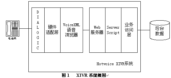 采用Hotvoice XIVR系統(tǒng)實現(xiàn)的新業(yè)務可以采用任何Web技術方便地和原有數(shù)據(jù)系統(tǒng)結合。用戶可以根據(jù)業(yè)務需求編寫靜態(tài)voiceXML腳本,或采用ASP/JSP/PHP等動態(tài)生成voiceXML腳本;與后臺數(shù)據(jù)系統(tǒng)間可以采用數(shù)據(jù)庫訪問,或采用XML/HTTP/DCOM或其他協(xié)議訪問。