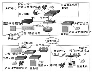 分行中心與下面的支行以及各儲蓄網(wǎng)點根據(jù)業(yè)務(wù)應(yīng)用需求出發(fā),可以利用邁普各系列路由器產(chǎn)品,通過DDN或者幀中繼把分行辦公大樓和營業(yè)部、支行辦公大樓和營業(yè)部、分行和支行下屬儲蓄所連起來。對于分行中心以及下面的支行,由于網(wǎng)絡(luò)結(jié)構(gòu)比較復(fù)雜,再加上網(wǎng)絡(luò)基礎(chǔ)設(shè)施建設(shè)已經(jīng)很完善,一般可以采用邁普IP語音網(wǎng)關(guān),通過它與原有的外部PSTN網(wǎng)絡(luò)相連。而對于一些較小的儲蓄網(wǎng)點,則可以通過采用帶有IP電話模塊的邁普路由器。邁普路由器的IP電話模塊可與電話機或交換機相連,能夠支持G.711、G.723、G.729等多種語音壓縮算法,并且還支持H.323協(xié)議,實現(xiàn)IP電話功能。