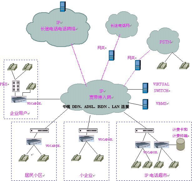 ISP及寬帶網(wǎng)絡(luò)運營商的本地電話接入網(wǎng)絡(luò),采用單級單域結(jié)構(gòu),在網(wǎng)內(nèi)安裝VIRTUALSWITCH虛擬交換系統(tǒng),它作為整個本地電話接入網(wǎng)絡(luò)的網(wǎng)守,以集中方式管理域內(nèi)的所有網(wǎng)關(guān)(VOCA-BOX),執(zhí)行地址翻譯,呼叫控制,帶寬管理,域管理等功能以及呼叫建立、拆除控制和呼叫管理等功能。在網(wǎng)內(nèi)安裝后臺計費、認(rèn)證系統(tǒng)(VBMS),對各個語音終端實現(xiàn)計費認(rèn)證及結(jié)算,同時完成號碼分配及網(wǎng)絡(luò)管理的功能。