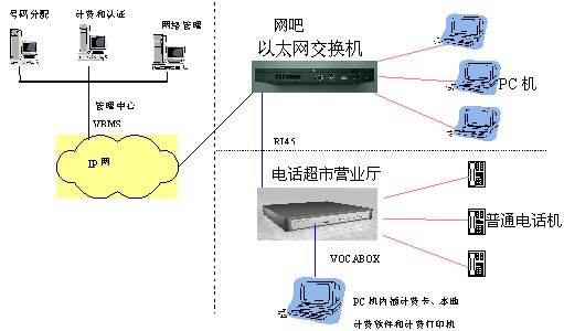 此方案的特點(diǎn)是將電話終端深入到公用電話的超市,用戶可以撥打IP長(zhǎng)途電話、PSTN普通電話用戶及移動(dòng)電話用戶,并在用戶端通過VOCA-BOX語(yǔ)音網(wǎng)關(guān)、計(jì)費(fèi)卡和計(jì)費(fèi)軟件實(shí)現(xiàn)本地營(yíng)業(yè)廳立即計(jì)費(fèi)的要求。在運(yùn)營(yíng)商的管理中心通過配置VBMS系統(tǒng)實(shí)現(xiàn)后臺(tái)集中計(jì)費(fèi)認(rèn)證功能,用于管理各個(gè)營(yíng)業(yè)中心的VOCA-BOX語(yǔ)音網(wǎng)關(guān),各營(yíng)業(yè)中心的VOCA-BOX語(yǔ)音網(wǎng)關(guān)提供認(rèn)證計(jì)費(fèi)信息給VBMS,計(jì)費(fèi)類型可按實(shí)際的需求配置如:預(yù)付費(fèi)、后付費(fèi)等。此方案可以擴(kuò)大ISP及寬帶網(wǎng)絡(luò)運(yùn)營(yíng)商的業(yè)務(wù)市場(chǎng),增加ISP及寬帶網(wǎng)絡(luò)運(yùn)營(yíng)商的收益。