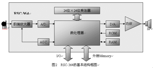由美國(guó)Sensory Integrated Circuit公司開(kāi)發(fā),2000年開(kāi)始生產(chǎn),是一顆為消費(fèi)類電子產(chǎn)品應(yīng)用的低價(jià)位的語(yǔ)音識(shí)別專用芯片,其結(jié)構(gòu)圖如圖2所示。