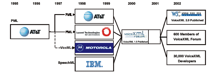 VoiceXML 是由IBM 、Lucent、Motorola 和AT&T 四家公司于2000年提出的一種應用于語音瀏覽的標記語言。如下圖所示,VoiceXML是各廠商多年經驗積累的產物,VoiceXML