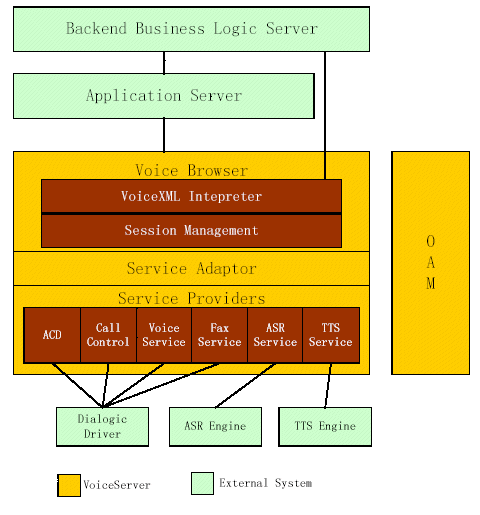 服務器應用于動態(tài)腳本。對于動態(tài)腳本,ASP、JSP、PHP等任何用于動態(tài)產生HTML腳本的技術均適用于VoiceXML。對于動態(tài)腳本,應用服務器還負責與后臺業(yè)務邏輯服務器接口。