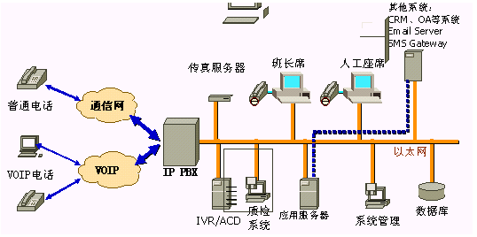 IP PBX系統(tǒng)代替?zhèn)鹘y(tǒng)PBX交換機系統(tǒng),實際上是一個SIP或H.323交換機,內(nèi)部分機采用純IP電話,提供呼叫路由、話務員分組管理、呼叫控制等功能,支持市場上主流IP
