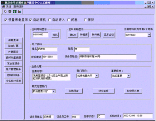 。。客戶打入電話后,當(dāng)系統(tǒng)的自動(dòng)語音應(yīng)答子系統(tǒng)無法解決客戶問題時(shí),客戶可選擇人工服務(wù),由航空公司客戶服務(wù)代表直接接聽客戶電話,處理并解決客戶問題。此時(shí)客戶同座席話務(wù)人員直接溝通,并同時(shí)記錄下該客戶的聯(lián)系方式,將相關(guān)數(shù)據(jù)添加入系統(tǒng)數(shù)據(jù)庫;也可以在數(shù)據(jù)庫的支持下回答機(jī)場(chǎng)航班/航空貨運(yùn)信息及相關(guān)規(guī)定等的咨詢和疑問、訂座/訂艙?蛻粢部梢赃x擇自動(dòng)語音服務(wù)方式,根據(jù)系統(tǒng)的語音提示輸入按鍵,選擇類別,將自己的投訴和建議以及自己的聯(lián)系方式信息以留言錄音的方式保存在系統(tǒng)中。系統(tǒng)同時(shí)還支持自動(dòng)傳真方式,客戶可以通過傳真機(jī)進(jìn)入本系統(tǒng),通過按鍵選擇傳真方式,將自己的意見建議等的文本內(nèi)容傳真給系統(tǒng),系統(tǒng)自動(dòng)接受并存入數(shù)據(jù)庫。