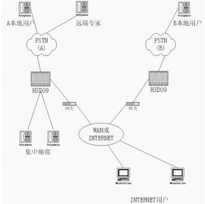 通過(guò)HXD09智能型可編程交換機(jī)構(gòu)建分布式呼叫中心(一個(gè)主呼叫中心,多個(gè)分呼叫中心),IPV 實(shí)現(xiàn)語(yǔ)音的遠(yuǎn)程傳輸;實(shí)現(xiàn)遠(yuǎn)程專(zhuān)家咨詢(xún)、集中管理座席的功能,其方式如下圖所示: