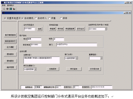 航空集團(tuán)運(yùn)行控制部門(mén)分布式通訊平臺(tái)系統(tǒng)的軟件設(shè)計(jì)采用業(yè)界先進(jìn)的三層CLIENT/SERVER體系結(jié)構(gòu),集目前先進(jìn)的計(jì)算機(jī)技術(shù)、通信技術(shù)、計(jì)算機(jī)電信集成(CTI)技術(shù)、呼叫接入技術(shù)、智能接入交換分配技術(shù)、數(shù)字語(yǔ)音處理技術(shù)、異構(gòu)系統(tǒng)信息交互技術(shù)、安全容錯(cuò)技術(shù)、網(wǎng)絡(luò)組網(wǎng)技術(shù)等于一體,并與航空集團(tuán)運(yùn)行控制部門(mén)已有技術(shù)支持系統(tǒng)(如飛行運(yùn)行控制系統(tǒng)、航路計(jì)劃系統(tǒng))緊密結(jié)合在一起,突破時(shí)空的限制,通過(guò)人工座席、自動(dòng)語(yǔ)音/傳真、相關(guān)部門(mén)工作人員等為集團(tuán)內(nèi)部提供電話(huà)、傳真服務(wù)形式的周到、快捷、全方位的通信服務(wù)。