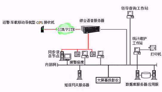 博宇科技110無線報警定位調(diào)度系統(tǒng)指揮調(diào)度中心的物理結構由帶語音板卡的高性能工控機、CTI服務器、接警座席、統(tǒng)計維護管理工作站、數(shù)據(jù)庫服務器/應用服務器、短消息網(wǎng)關服務器、同步數(shù)字錄音工作站、網(wǎng)絡系統(tǒng)和大屏幕投影儀等以及所開發(fā)的有關應用軟件構成。
