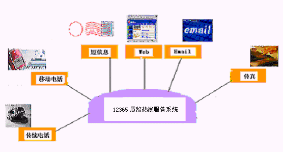 人民群眾利用電話、傳真、手機、電子郵件、因特網(wǎng)、短消息等撥打國家質(zhì)量技術監(jiān)督局規(guī)定的統(tǒng)一特服號碼(12365)進入12365質(zhì)監(jiān)熱線服務系統(tǒng),本系統(tǒng)依托質(zhì)量技術監(jiān)督局各類業(yè)務技術支持系統(tǒng)和網(wǎng)絡系統(tǒng),通過人工受理或自動語音服務等方式全天24小時不間斷地為客戶提供各種服務。