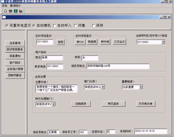 人民群眾打入電話后,當系統(tǒng)的自動語音應答子系統(tǒng)無法解決客戶問題時,客戶可選擇人工服務,由企業(yè)客戶服務代表直接接聽客戶電話,處理并解決客戶問題。此時客戶同座席話務人員直接溝通,并同時記錄下該客戶的聯(lián)系方式,將相關數(shù)據(jù)添加入系統(tǒng)數(shù)據(jù)庫;也可以在數(shù)據(jù)庫的支持下回答質(zhì)量監(jiān)督咨詢、投訴等?蛻粢部梢赃x擇自動語音服務方式,根據(jù)系統(tǒng)的語音提示輸入按鍵,選擇類別,將自己的投訴和建議以及自己的聯(lián)系方式信息以留言錄音的方式保存在系統(tǒng)中。系統(tǒng)同時還支持自動傳真方式,客戶可以通過傳真機進入本系統(tǒng),通過按鍵選擇傳真方式,將自己的意見建議等的文本內(nèi)容傳真給系統(tǒng),系統(tǒng)自動接受并存入數(shù)據(jù)庫。