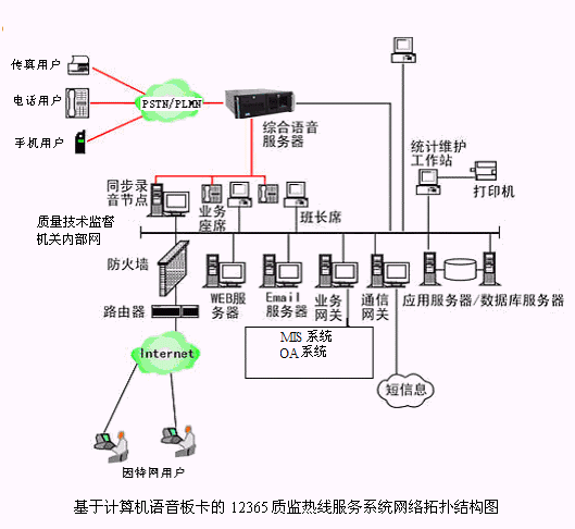基于計算機語音板卡的12365質(zhì)監(jiān)熱線服務系統(tǒng)網(wǎng)絡拓撲結(jié)構(gòu)圖