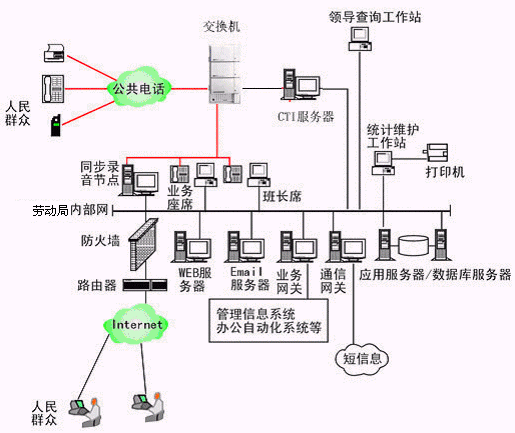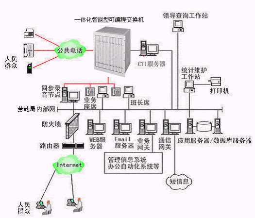 勞動(dòng)局多媒體呼叫中心系統(tǒng)主要是由智能型可編程交換機(jī)或帶語音板卡的工控機(jī)或排隊(duì)交換機(jī)、CTI服務(wù)器、IVR(交互式語音應(yīng)答)/IFR(交互式傳真應(yīng)答)子系統(tǒng)、人工座席子系統(tǒng)、應(yīng)用服務(wù)器、數(shù)據(jù)庫(kù)服務(wù)器、業(yè)務(wù)網(wǎng)關(guān)子系統(tǒng)、WEB服務(wù)器、電子郵件服務(wù)器、防火墻、通信網(wǎng)關(guān)等硬件設(shè)備和應(yīng)用軟件組成。