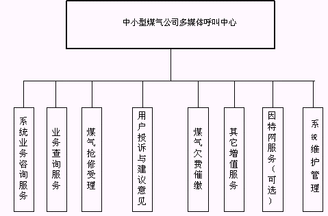 客戶利用電話、手機等撥打某一特服號碼(如9xxxx)進入中小型煤氣公司多媒體呼叫中心系統(tǒng),本系統(tǒng)依托煤氣公司各類業(yè)務(wù)技術(shù)支持系統(tǒng)和網(wǎng)絡(luò)系統(tǒng),通過人工受理或自動語音服務(wù)等方式全天24小時不間斷地為客戶提供各種服務(wù)。