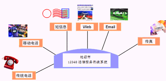 居民利用電話、傳真、手機(jī)等撥打某一特服號碼(如12348)進(jìn)入地級市法律服務(wù)熱線系統(tǒng),本系統(tǒng)依托地級市司法行政部門/法院各類業(yè)務(wù)技術(shù)支持系統(tǒng)和網(wǎng)絡(luò)系統(tǒng),通過人工受理或自動語音服務(wù)等方式全天24小時(shí)不間斷地為人民群眾提供各種法律服務(wù);形成了對外服務(wù)于百姓的無形窗口,對內(nèi)管理、分析、決策系統(tǒng)相結(jié)合的多媒體呼叫中心。