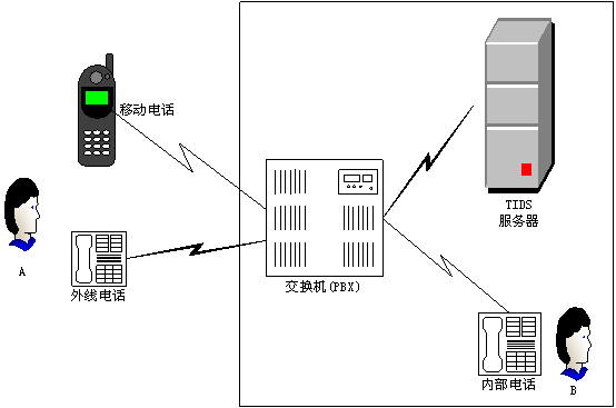 如圖1所示,在一個典型的應(yīng)用環(huán)境里,TIDS系統(tǒng)可與公司或單位的電話交換機通過一條或若干條模擬電話線相連。未來TIDS的版本將可支持E1/T1數(shù)字中繼線?梢詫IDS設(shè)置為缺省的電腦話務(wù)員,即用戶呼叫直接由TIDS系統(tǒng)處理;也可以分配一個分機號碼給TIDS,當(dāng)用戶需要時可撥該號碼使用TIDS服務(wù)。在后一種情況下,最好是在交換系統(tǒng)的問候語中提示用戶如何撥打TIDS系統(tǒng)。