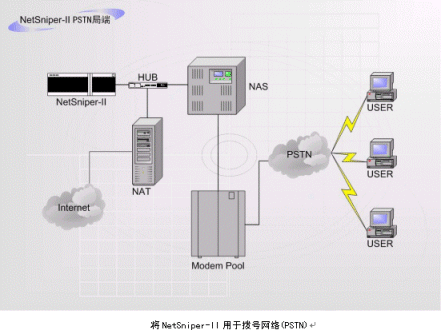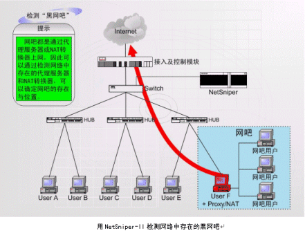 上圖中,NetSniper-II可以對網(wǎng)絡內(nèi)部各用戶進行檢測,一旦發(fā)生某個用戶安裝代理服務器軟件,其他用戶通過該用戶的接口上網(wǎng)偷逃網(wǎng)費的情況,或發(fā)現(xiàn)盜用MAC地址上網(wǎng)及通過Modem回撥上網(wǎng)的情況,NetSniper-II即可定位這些用戶,并且采取通知系統(tǒng)管理員或自動封堵非法用戶等措施。