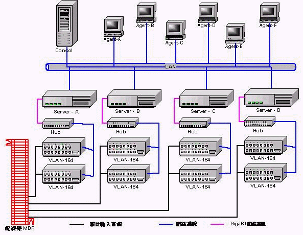 - 系統(tǒng)主要包括二大主機并由網(wǎng)絡(luò)聯(lián)機(TCP/IP協(xié)議)作為彼此與遠程的溝通橋梁。一是錄音接口主機(VLAN-164)具備模擬輸入音源的匹配接口、音源數(shù)字化、網(wǎng)絡(luò)聯(lián)機輸出。一是數(shù)據(jù)庫服務(wù)器(DataBase
