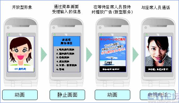 以往的IVR根據(jù)選擇項、層數(shù),必須多遍聽取語音內(nèi)容才能找到預(yù)期的菜單,成了一大課題。視頻呼叫中心則在FOMA的畫面上顯示服務(wù)菜單,通過選擇號碼可以簡化聽取語音的過程。而且,在連接客服人員的電話等待時間中可以播放廣告。通過靈活運用這些功能,提高了IVR的操作性,提供了新型廣告宣傳的機會。