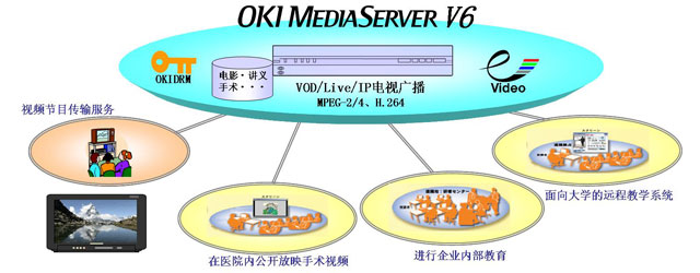 在OKI的通用視頻服務(wù)器系統(tǒng)上,將具有代表性的視頻傳輸功能作為標(biāo)準(zhǔn)服務(wù)要素,以解決方案的形式提供給用戶。以VOD(視頻點(diǎn)播)實(shí)時(shí)傳輸系統(tǒng)、中繼及監(jiān)視系統(tǒng)為代表,可以簡(jiǎn)單便捷構(gòu)筑靈活運(yùn)用視頻及語(yǔ)音的豐富多彩的系統(tǒng)。URL:http://www.oki.com/jp/BMC/。