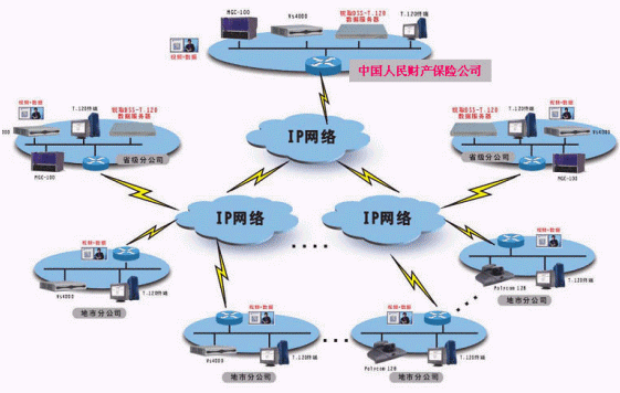 中國人民財產(chǎn)保險股份有限公司,是中國內(nèi)地最大的非壽險公司,香港證交所上市公司。經(jīng)過50多年的發(fā)展,中國人保財險公司已經(jīng)發(fā)展成為網(wǎng)點(diǎn)遍布全國31個省市區(qū),共有營業(yè)機(jī)構(gòu)4000余個的大型商業(yè)公司。為提高辦公效率,降低差旅成本,中國人保財險公司決定建設(shè)覆蓋從總公司、省分公司到地市分公司的視頻會議系統(tǒng),項目總?cè)萘窟_(dá)600多個節(jié)點(diǎn),采用兩級級連方式組網(wǎng),要求系統(tǒng)具備視頻、音頻、數(shù)據(jù)交互功能,。
