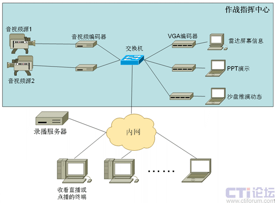 圖2所示的錄播系統(tǒng)可以同步錄制2路音視頻信號和3路電腦屏幕信號。音視頻信號可以是對抗雙方的實時畫面,而電腦屏幕信號則可以是指揮中心里的各種指揮輔助系統(tǒng)的顯示,如雷達屏幕信息、沙盤推演動態(tài)、作戰(zhàn)計劃以及戰(zhàn)情匯報的ppt演示,所有這些內容都可以非常方便地同步錄制下來。內網(wǎng)里的所有有權限的人員都可以實時收看這些內容,同時,這些存儲下來的內容也可以進行事后點播,用于分析、講評。
