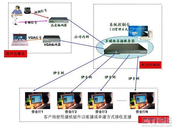如上圖所示,在多媒體股評直播室中,股評師的講解圖像和聲音以及電腦中分析數(shù)據(jù)同步傳輸采集到控制機(jī)房中,通過多媒體錄播服務(wù)器直播模塊的組播方式將信息傳達(dá)給全國遍布的營業(yè)網(wǎng)點(diǎn),實(shí)現(xiàn)股評直播的需求。(權(quán)威股評師將在每天下午股市休市后對一天當(dāng)中股票大盤做一次全面的分析,并對本周或某行業(yè)的形式做一個全面的總結(jié),并對未來形勢做出判斷。)
