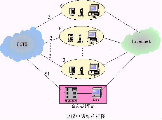 中:SPAS-2000作為組成會(huì)議電話平臺(tái)的主要交換平臺(tái),Host作為業(yè)務(wù)管理平臺(tái),它們共同組成會(huì)議電話平臺(tái).A,B,N等作為使用會(huì)議電話平臺(tái)的用戶,它們有固定電話(作為會(huì)議電話使用),手機(jī)和電腦.它們均可作為某個(gè)會(huì)議電話的主持人.