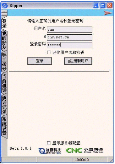 在主界面上選擇"注冊新用戶",這時(shí)會(huì)出現(xiàn)網(wǎng)通的注冊界面,選擇"開始注冊",然后將各項(xiàng)用戶信息填寫清楚后,創(chuàng)建用戶,成功后即可回到sipper界面登陸。