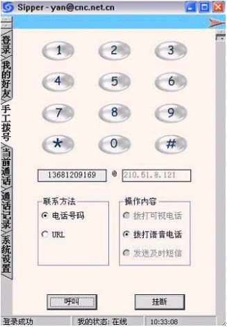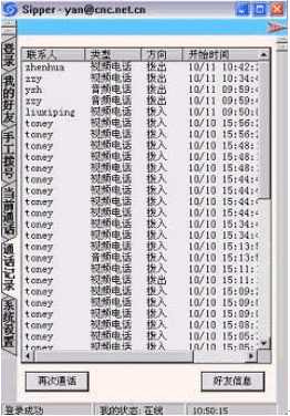 點(diǎn)擊后會(huì)出現(xiàn)對話窗口,同時(shí)在對方的機(jī)器上會(huì)出現(xiàn)你的呼叫請求,如果對方"接收"了你的請求,則兩個(gè)人的語音對話開始,雙方可以互相聽到聲音,沒有圖象,可以同時(shí)進(jìn)行短信交流。
