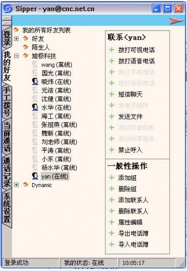 可以在這里進(jìn)行所給的各項(xiàng)操作,選擇添加聯(lián)系人,輸入某個(gè)用戶的各項(xiàng)個(gè)人信息,確認(rèn)后,這個(gè)用戶就會(huì)被添加到相應(yīng)的組中,并且會(huì)顯示出該用戶狀態(tài)。