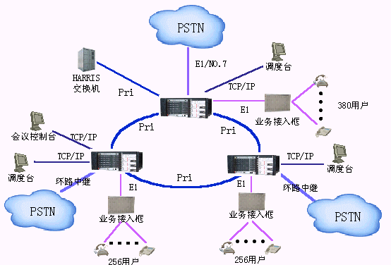 該方案適用于用戶需要建立自己的通信網(wǎng)并能實現(xiàn)行政交換、電話會議、調(diào)度交換、語音信箱等多種功能。這種方案解決的業(yè)務種類多,能滿足用戶的多種需要。