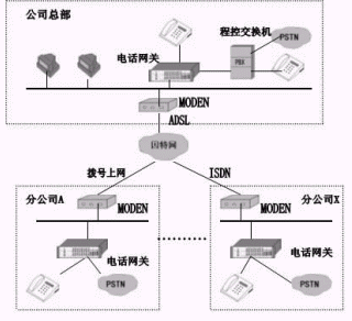 本方案采取IP語音接入的方法,利用88IP動態(tài)域名解析系統(tǒng),將IPMUX電話網(wǎng)關(guān)的網(wǎng)絡(luò)接口接入到公司和分部(分公司)的局域網(wǎng)中,通過ADSL、ISDN、撥號上網(wǎng)等方式,同連接在此因特網(wǎng)上的其它IPMUX電話網(wǎng)關(guān)相連,從而將不同地域的電話連接在一起,組成整個公司的IP電話網(wǎng),以達到免費通話的目的。