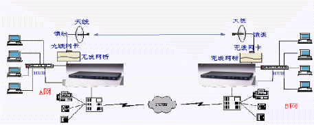 A網(wǎng)與B網(wǎng)分別為兩個(gè)局域網(wǎng),通過兩臺(tái)WavePoint II無(wú)線網(wǎng)橋?qū)蓚(gè)局域網(wǎng)連在一起,網(wǎng)橋上的RJ45口或BNC細(xì)纜接口與局域網(wǎng)相連。每臺(tái)網(wǎng)橋上插有一塊WaveLAN無(wú)線PC卡,PC卡的射頻輸出端口,通過饋線接到天線,通過PC卡來(lái)完成無(wú)線鏈路的連通。無(wú)線網(wǎng)橋連接完成后的效果類似HUB級(jí)連。IP語(yǔ)音網(wǎng)關(guān)-HGW-904的局域網(wǎng)接口(RJ45)連接到局域網(wǎng)的HUB上,根據(jù)用戶實(shí)際的話務(wù)量,選用Line端口接入用戶電話交換機(jī)(PBX),PBX接普通電話機(jī)和傳真機(jī),并連接至電話公網(wǎng)(PSTN)。其中所需設(shè)備:HGW-904