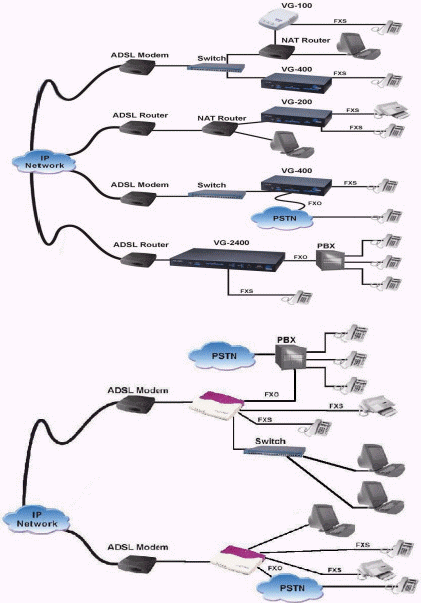 總部采用可堆疊的VG-2000,通過IP網(wǎng)絡(luò)(互聯(lián)網(wǎng))同各中心或分支機(jī)構(gòu)的相連,利用PBX(小型電話交換總機(jī))的交換能力將話音自動(dòng)轉(zhuǎn)到VG-2000上,通過數(shù)據(jù)專線、VPN或Internet傳輸?梢栽赩G-2000上進(jìn)行流量控制(Bandwidth
