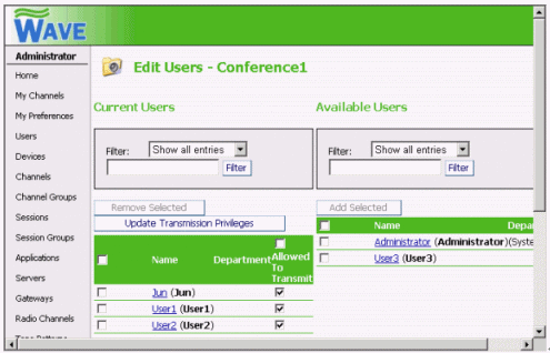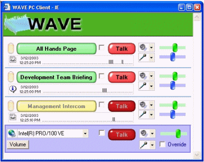 WAVE的使用方式為:管理員在服務(wù)器端建立IP電話會議,參加者使用本地計算機(jī)作為客戶端,通過耳機(jī)和麥克風(fēng)即可加入會議。一臺普通的奔四PC機(jī)可以支持?jǐn)?shù)千個會議,每個會議也允許數(shù)百個用戶參加。管理員可以分配用戶不同的權(quán)利:如講話,主持會議等等。