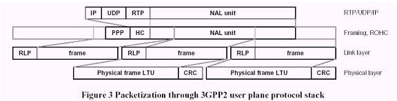 因為包交換服務(wù),3GPP/3GPP2同意了一個基于IP的協(xié)議棧。圖3展示了一個NAL單元通過3GPP2用戶平面協(xié)議堆棧被封裝在RTP/UDP/IP的典型過程。在頭壓縮(RoHC)后,此IP/UDP/RTP包被封裝進一個PDCP/PPP2包,變成了頻率鏈路控制(RLC)和服務(wù)數(shù)據(jù)單元(SDU)。RLC協(xié)議可以在三種模式下工作:透明、非確認(rèn)和確認(rèn)模式。RLC協(xié)議為用戶和數(shù)據(jù)提供分段和重傳服務(wù)。在透明和非確認(rèn)模式,RLC被定義為單向的;在確認(rèn)模式,RLC被定義為雙向的。對於所有的RLC模式,循環(huán)冗余檢查(CRC)的錯誤檢測在物理層上被運行,而且CRC檢查的結(jié)果和真實的數(shù)據(jù)一起被遞送到 RLC。在透明模式中,沒有上層的協(xié)議被增加到較高層的數(shù)據(jù)中。錯誤的協(xié)議數(shù)據(jù)單元(PDUs)可以被丟棄或標(biāo)記為錯誤。在非確認(rèn)模式中,沒有重傳協(xié)議在使用中,而且數(shù)據(jù)傳送沒有保證。接受到的錯誤數(shù)據(jù)根據(jù)配置來決定丟棄或標(biāo)記為錯誤。在確認(rèn)模式中,一種自動的重復(fù)請求機制被用于錯誤訂正。