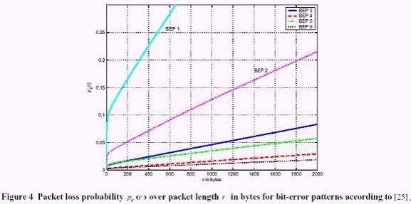 數(shù)組3到6的仿真結(jié)果更可靠,在會話應(yīng)用中需要低錯誤率的運送者。 假定一任意的字節(jié)的開始位置在文件包可能發(fā)生錯誤的位置里面。 這些錯誤可能性的所有數(shù)據(jù)錯誤在圖4中被顯示。 明顯可以看出錯誤率會因為包長度的增加而提高。從位率錯誤表格(BEP1和2)可知,當(dāng)包長度減少的時候丟包率是不可以接受的, 舉例來說,500個字節(jié), 丟失可能性高達25%. 高的錯誤率需要在鏈路層上重傳。