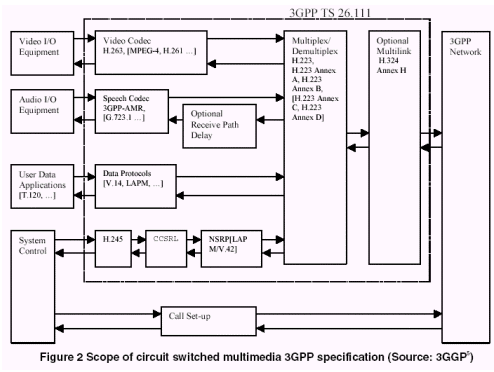 3G網(wǎng)絡(luò)上用于視頻通訊的3GPP標(biāo)準(zhǔn)定義了使用于視頻消息傳送(參看3.3部分)和視頻呼叫的視頻解碼器。在交換線路上實(shí)行64kbps速率的實(shí)時(shí)呼叫時(shí),H.263是推薦標(biāo)準(zhǔn),如圖2所示。可選的其他視頻解碼器中,MPEG-4和H.261不是標(biāo)準(zhǔn)所要求的,但可作為可能的候選標(biāo)準(zhǔn)。