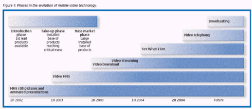 早期的市場試驗和市場調(diào)查都已顯示,用戶愿意消費和支付移動視頻服務。用戶通過MMS接受的視頻片斷消費被視為首個大規(guī)模市場服務,緊接著就是通過下載和流媒體接受的視頻斷片。這對開展例如移動視頻服務行業(yè)工作,和取得現(xiàn)成移動用戶市場都是非常重要的。隨著EDGE/WCDMA網(wǎng)絡的部署和智能手機的不斷普及,移動視頻服務在移動增值領域占據(jù)的地位將越來越重要。