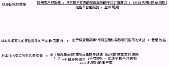 主要的因素有:終端客戶群的規(guī)模、定位平臺的投資、建設(shè)周期,請看下列公式(未經(jīng)實(shí)際統(tǒng)計(jì)驗(yàn)證,僅僅用于估算):
